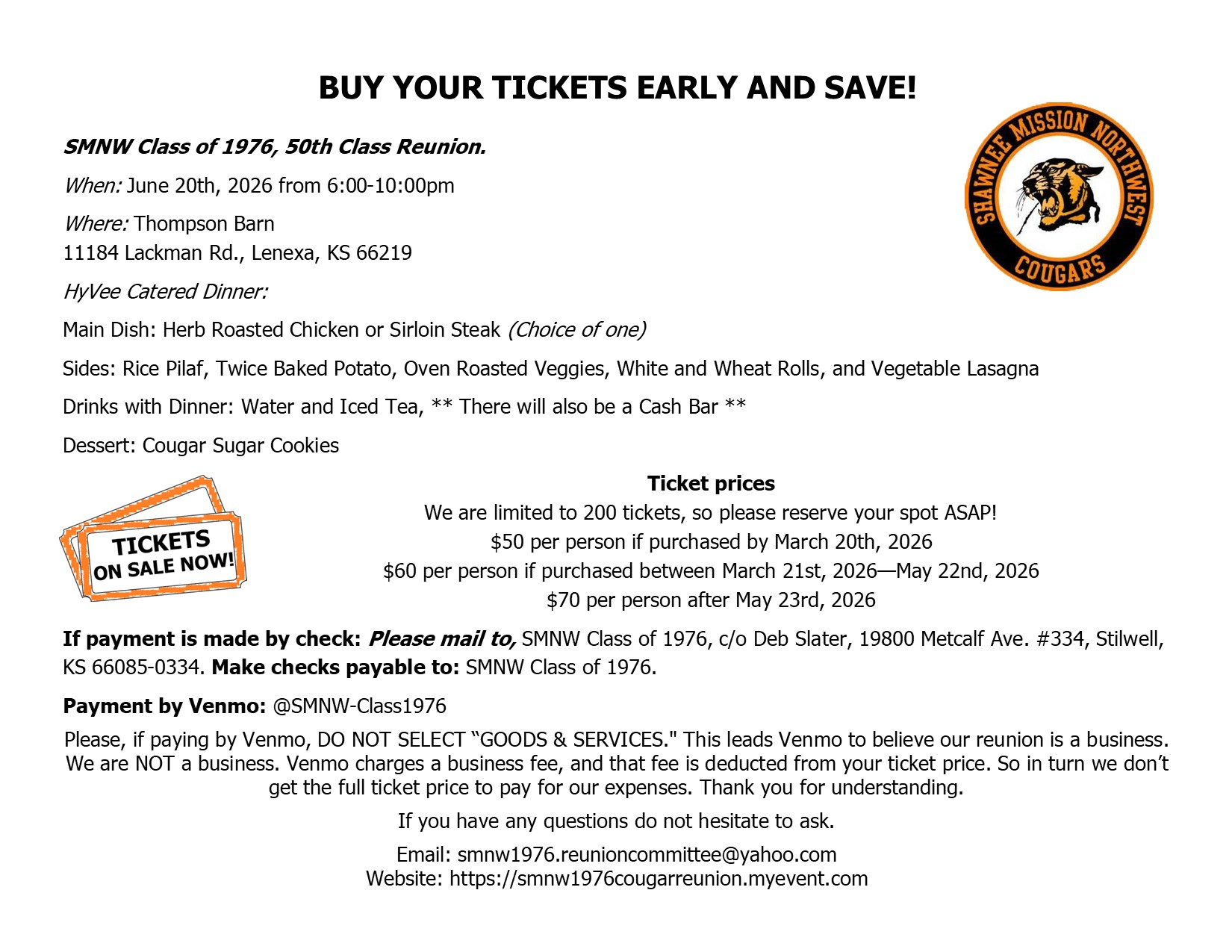 Payment can be made by cash or check. Mail to: SMNW Class of 1976, c/o Deb Slater, 19800 Metcalf Ave. #334, Stilwell, KS 66085-0334. Make checks payable to SMNW class of 1976.